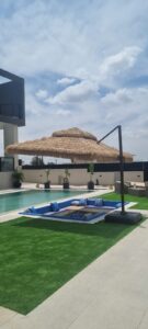 שמשיות יוקרה קש רגל צד 3×3 מאלונמיום עם תאורת לד סולארית ובסיס 150 קג הכי יפות ואכותיות שיש אטום לגשם .